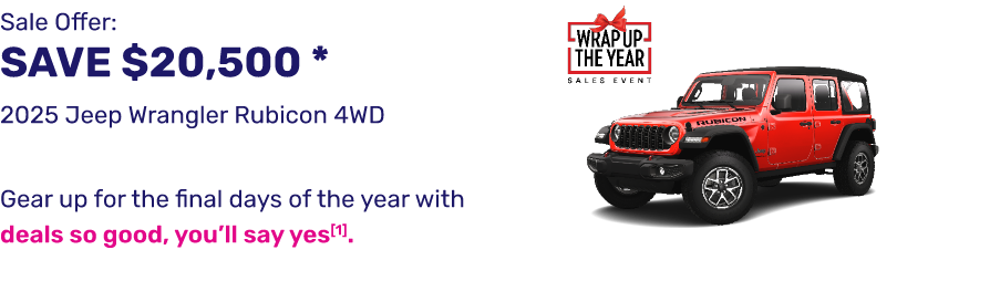 * Offer valid on 2025 Jeep Wrangler Rubicon 4WD. Example Deal: MSRP: $68,285. WHCJDR Discount: $10,000, plus $10,500 Manufacturer Rebate. Sale Price: $47,785. Valid on VIN: 1C4RJXFG3SW633965, 1C4PJXFG2SW612399. Based on approval of program ID 25CSA, 25CSA1, 39CSS, 40CSY, 41CSJ6. Subject to credit approval. Not all will qualify for lowest payment through participating lender, Stellantis Financial. Down payment and monthly payment may vary. Excludes taxes, tags, registration and title, insurance, and dealer charges. A negotiable dealer documentary service fee of up to $200 may be added to the sale price or capitalized cost. Exp. 1/5/2026. [1] West Hills Autoplex Year End Sales Event based on incentives and clearance offers through individual manufacturers. See individual dealer for all details related to offers. A negotiable dealer documentary service fee of up to $200 may be added to the sale price or capitalized cost. Offers expire 12/31/25.[2] 90 Days until First Payment through participating lender, See Dealer for details. A negotiable dealer documentary service fee of up to $200 may be added to the sale price or capitalized cost. All offers expire on 12/31/25.[3] Receive a $10 Amazon.com gift card with test drive while supplies last, limit one per customer. All offers expire 12/31/2025.